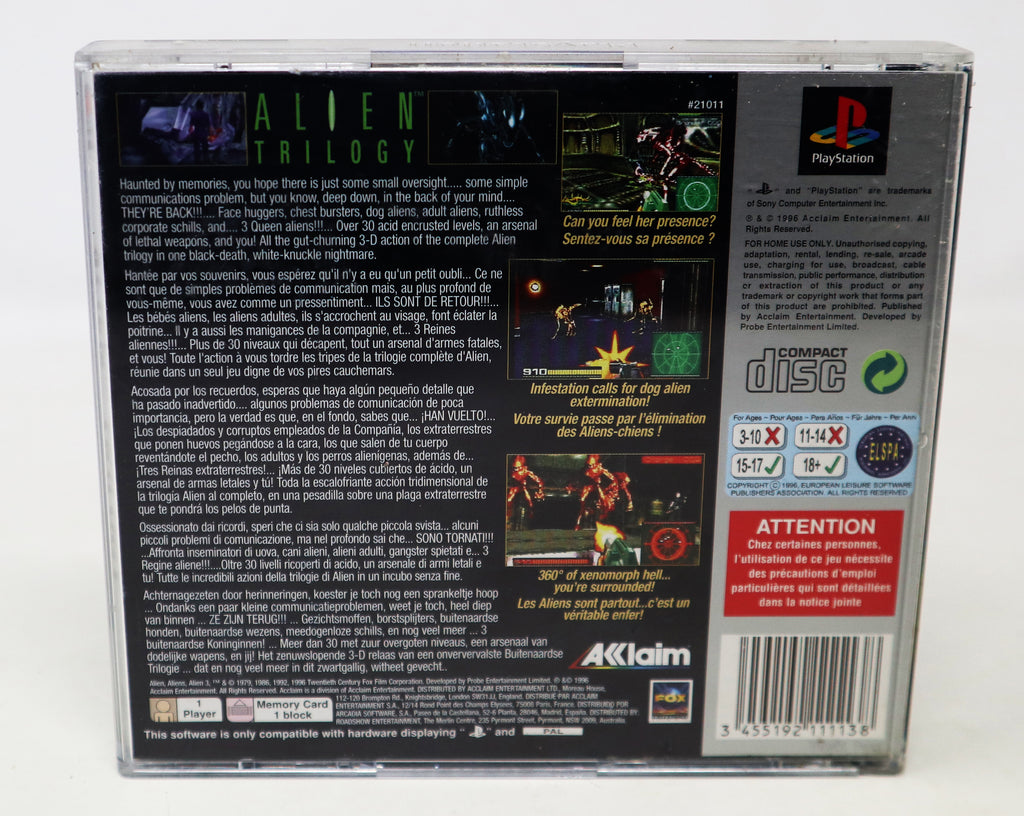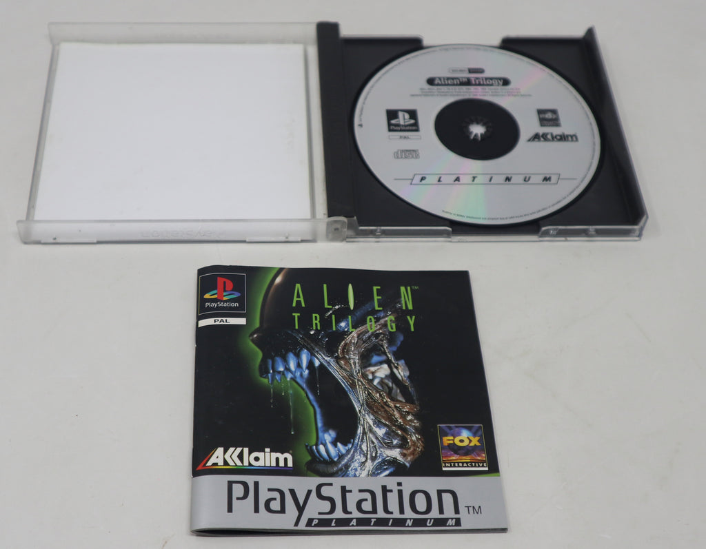 Alien Trilogy is a great trio of PlayStation 1 games. It comes in good hardly used condition and complete with the Instruction booklet, as shown. The jewel case is in good condition considering its age with surface scratches/scuffs/residue, as shown. It is printed with '1996 Acclaim Entertainment' and 'Sony Computer Entertainment Inc.' on the back.